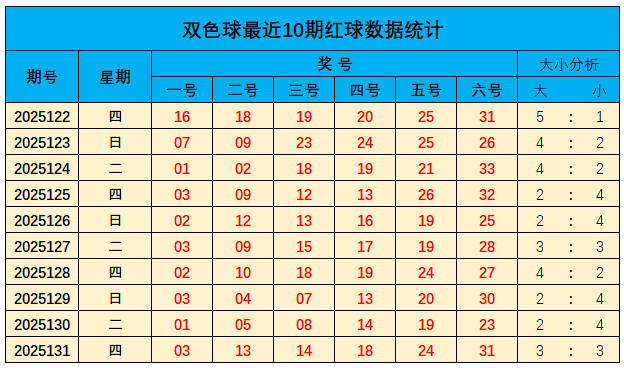 上期红球大小比为3:3,近10期大小比为31:29;总体上大奖号走势稍热,本期关注大数较上期走势保持,推荐大小比为:3:3