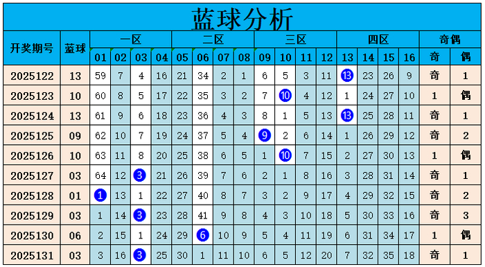 蓝球分析:上期蓝球开出偶数号码03,近10期奇偶比为7:3,奇数走势稍热,近十期蓝球奇偶走势为:奇-偶-奇-奇-偶-奇-奇-奇-偶-奇-,本期蓝球关注偶数开出;本期蓝球参考:10