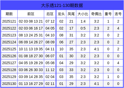 当期前区号码大小比为2:3,三区比为1:2:2,奇偶比为4:1,重号未开出,连号未开出。后区开出小大、偶奇组合的号码02、11。