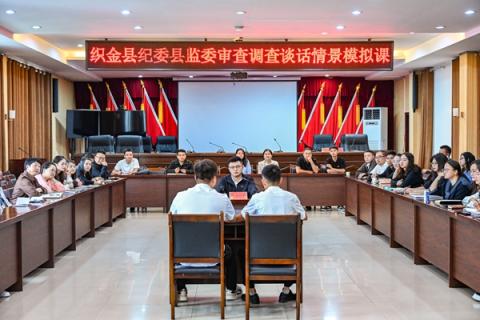 贵州省织金县纪委监委创新培训方式,聚焦审查调查全流程,举办“情景课堂”开展全链条纪法培训,以“情景模拟+实操”的方式逐项拆解谈话、审理等关键环节纪法要求和实操要点,帮助纪检监察干部打通纪法衔接“堵点”,进一步提升依规依纪依法开展监督执纪能力。图为织金县纪委监委业务骨干通过现场演绎,讲解审查调查谈话中的注意事项。(贵州省织金县纪委监委 邓蓝青 摄)
